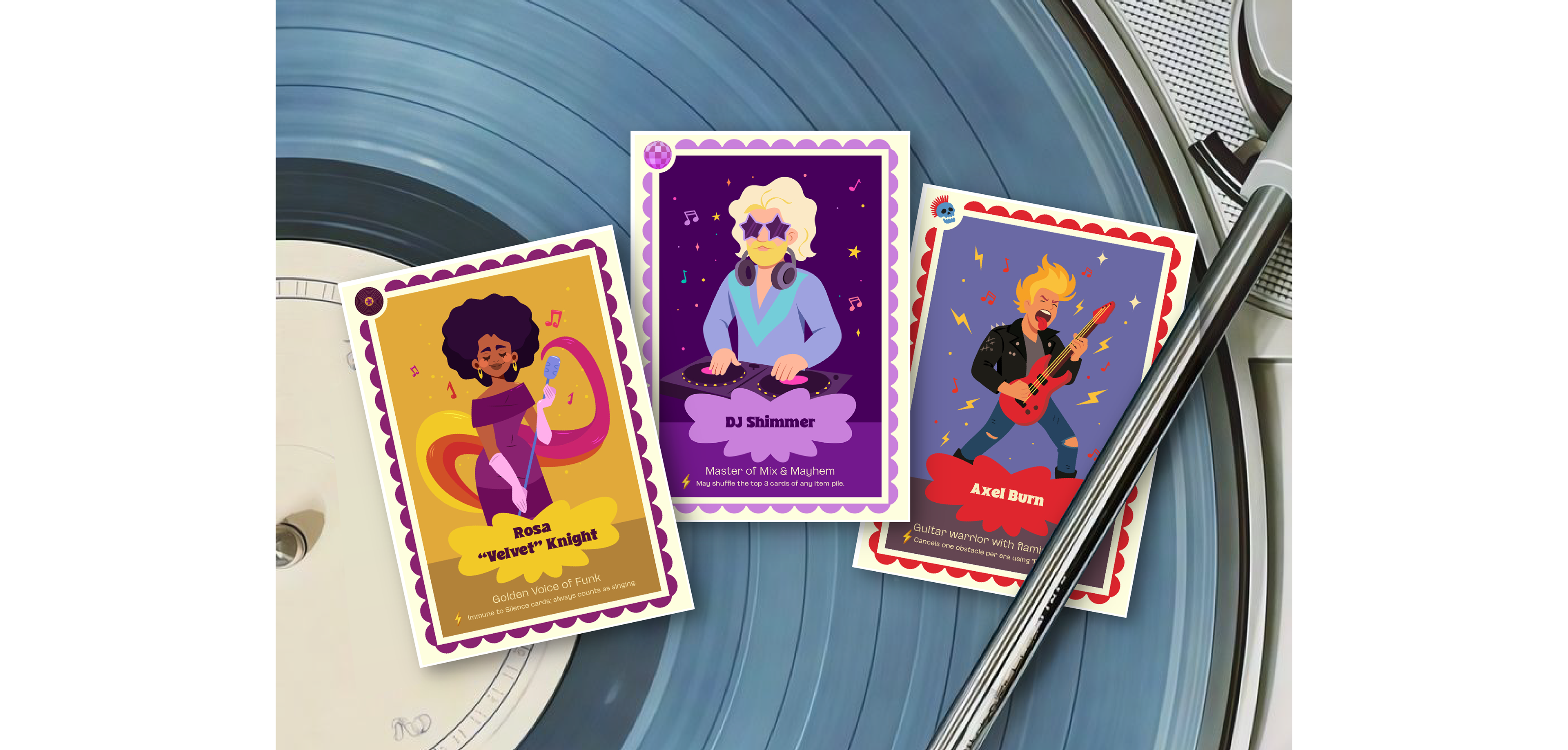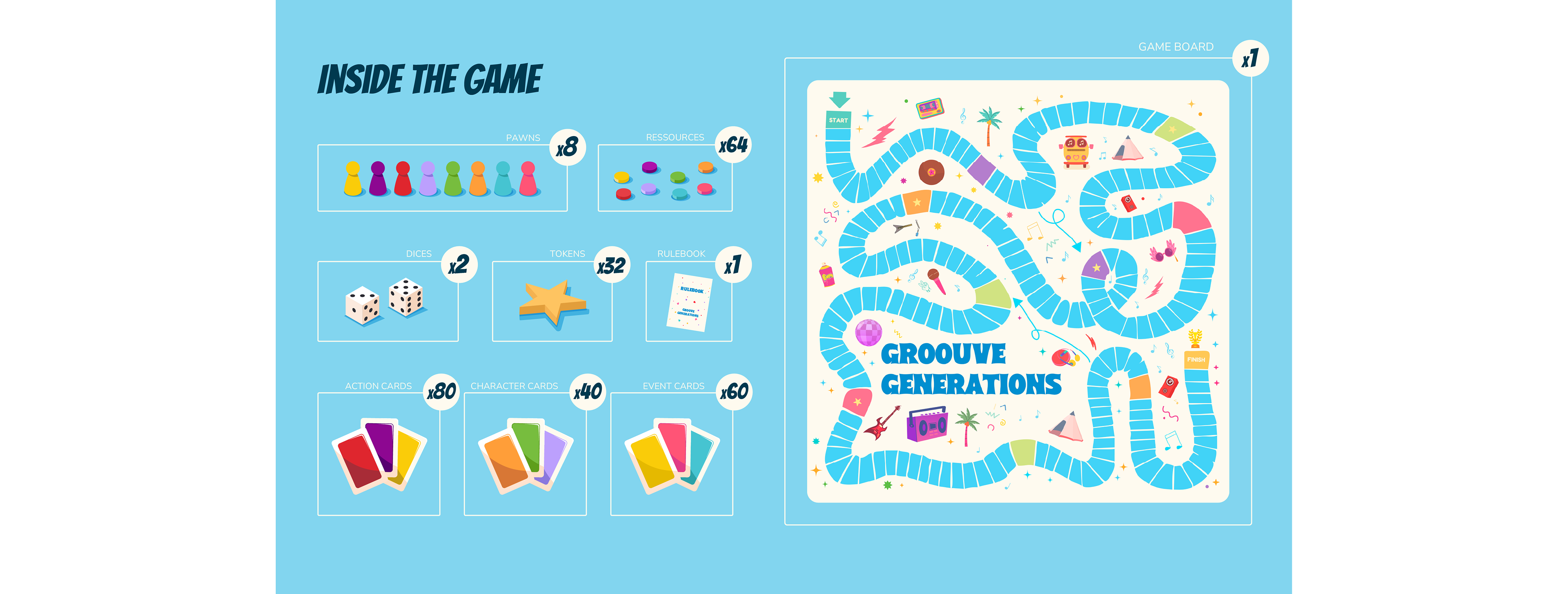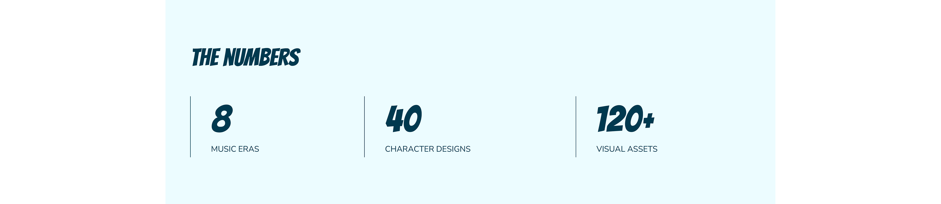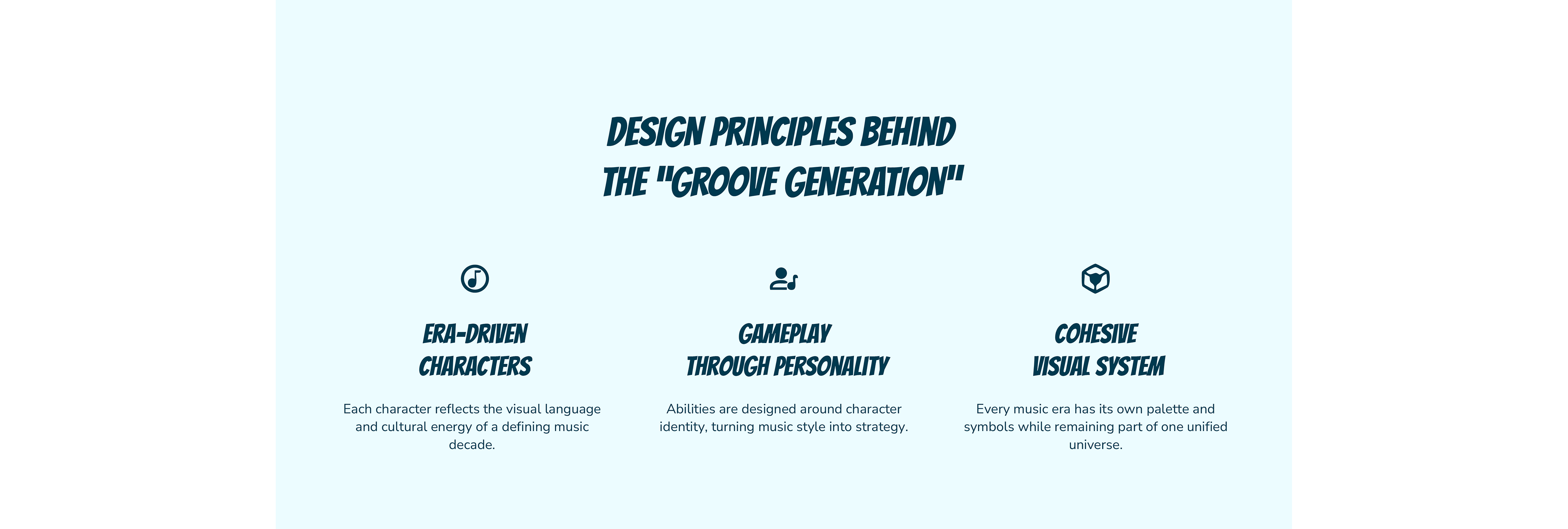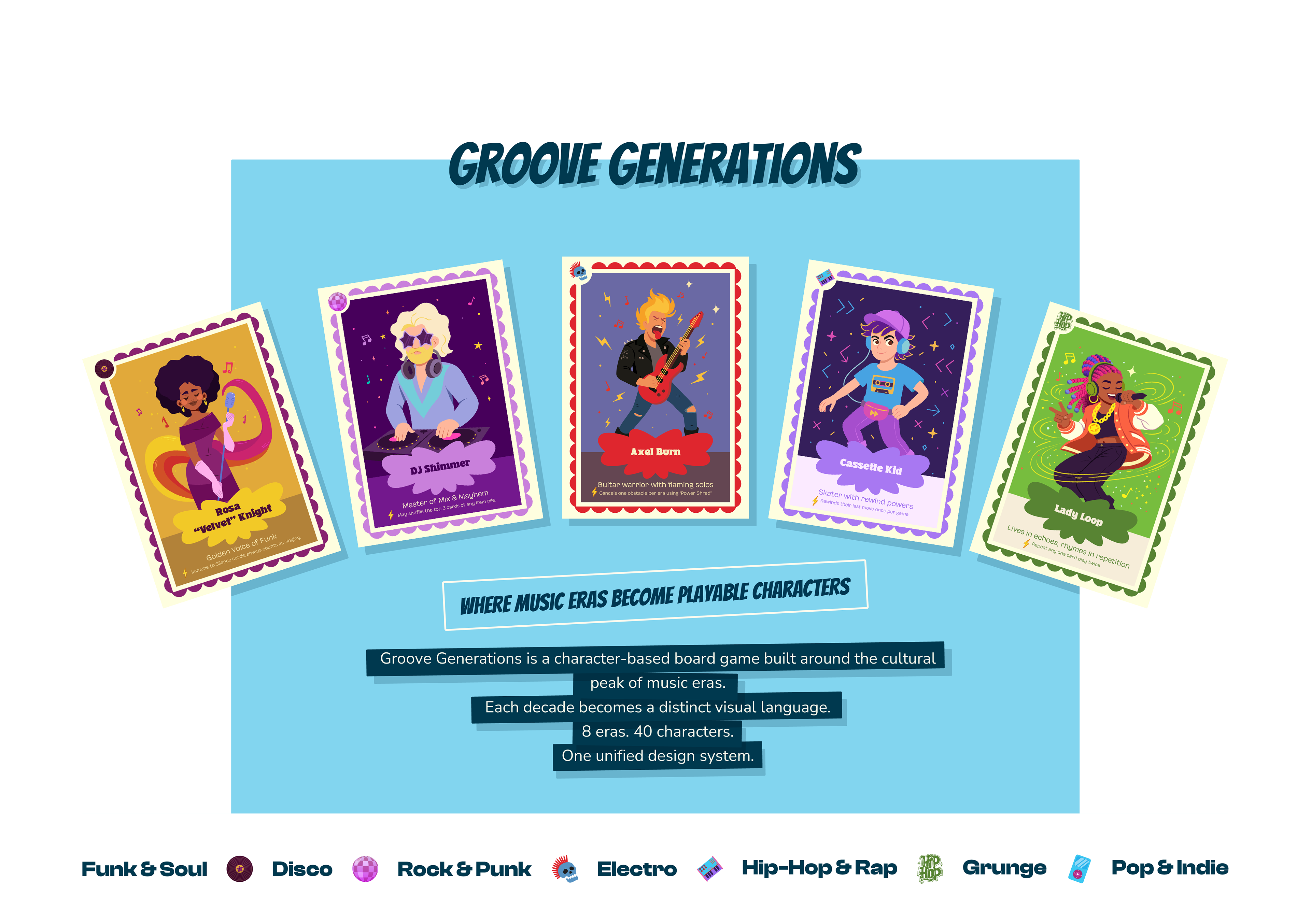 Groove Generations is a character-based board game built around 8 music eras. The design challenge was to create 40 distinct characters with strong individual visual identities, each era with its own palette, typography, and visual language, while maintaining coherence as one unified system.